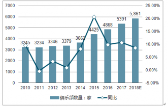 2010-2019年中國健身俱樂部數(shù)量及同比增速