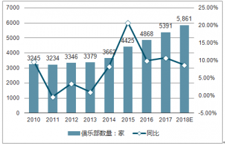 2010-2019年中國健身俱樂部數(shù)量及同比增速