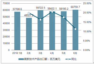 在2019年6月中國高新技術(shù)產(chǎn)品出口金額方面,6月中國高新技術(shù)產(chǎn)品出口金額60759.7百萬美元,同比增長11.5%。1-6月中國出口高新技術(shù)產(chǎn)品累計(jì)金額比去年的同時(shí)期增長18.3%.