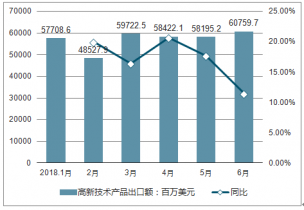 在2019年6月中國(guó)高新技術(shù)產(chǎn)品出口金額方面,6月中國(guó)高新技術(shù)產(chǎn)品出口金額60759.7百萬美元,同比增長(zhǎng)11.5%。1-6月中國(guó)出口高新技術(shù)產(chǎn)品累計(jì)金額比去年的同時(shí)期增長(zhǎng)18.3%.