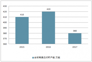截止2017年9月,全球南美白對蝦產(chǎn)能是380萬噸,2016年是420萬噸。