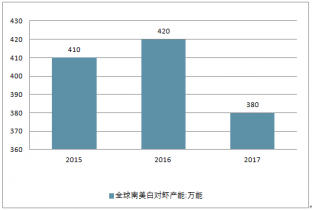 截止2017年9月,全球南美白對蝦產(chǎn)能是380萬噸,2016年是420萬噸。