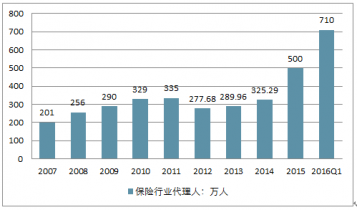 2007-2016Q1保險行業(yè)代理人規(guī)模(單位:萬人)