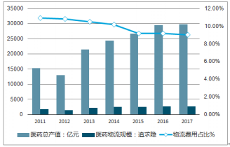 2011-2017年中國醫(yī)藥總產值及醫(yī)藥物流市場規(guī)模情況