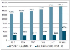 截止2018上半年,中國(guó)電子設(shè)備行業(yè)企業(yè)數(shù)量增長(zhǎng)至至16071家。其中虧損企業(yè)數(shù)量為4351家,虧損總額為544.1億元。