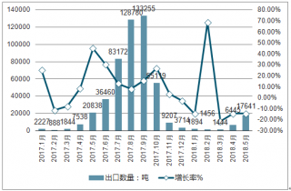 2017-2018年5月各月中國圣誕用品出口數(shù)量及增長走勢