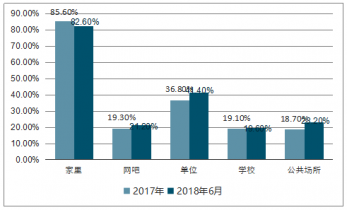 2017-2018年上半年中國網(wǎng)民使用電腦接觸互聯(lián)網(wǎng)的場所