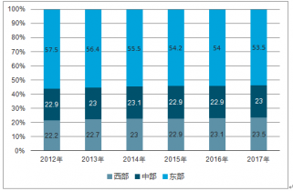 2017年,東部地區實現電信業務收入6759億元,比2016年增長6.6%,占全國電信業務收入比重為53.5%,占比較2016年減少0.5個百分點。中部和西部實現電信業務收入分別為2908億元和2978億元,比2016年增長7.4%和8.5%,占比分別為23%和23.5%,比2016年提升了0.1個、0.4個百分點。
