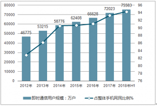 2012-2018年上半年中國即時通信用戶規(guī)模及占比走勢分析