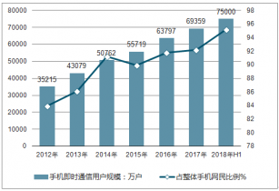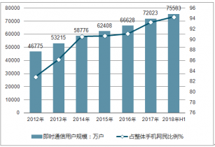 2018上半年中國手機即時通信用戶規(guī)模為75000萬人,與2017年末相比增長5641萬人,占手機網(wǎng)民的95.2%。