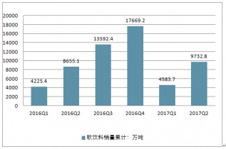 2017年1-6月中國軟飲料銷售量累計(jì)為9732.8萬噸,同比增長12.45%。2016年中國軟飲料銷售量累計(jì)為17699.2萬噸。