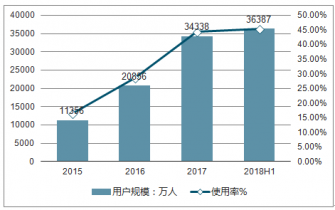 2015-2018年上半年網上訂外賣用戶規模及使用率走勢