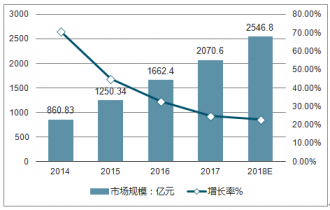 目前,國內在線外賣市場日益擴大,龐大的消費需求對于商家來說,菜肴包不失為一個省時、省力的選擇。近年來,中國在線餐飲外賣市場規模不斷增長,但是隨著外賣市場的逐漸普及,增速有所放緩,預計未來兩年增速仍然能保持在20%左右。2018年中國在線餐飲外賣市場規模達到2070.6億元,增長率為25%。隨著中國在線餐飲外賣市場的逐漸成熟,預計2018年在線餐飲外賣市場規模將有望突破2500億元。