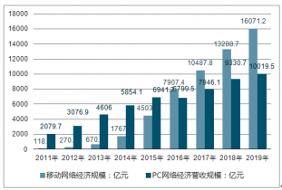 2011-2019年中國PC和移動網(wǎng)絡(luò)經(jīng)濟(jì)營收規(guī)模走勢