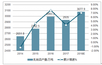 2014-2018年中國乳制品產(chǎn)量及增長走勢