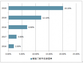 2016-2020年中國智能門鎖市場滲透率走勢