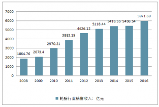 2008年我國輪胎行業(yè)銷售收入為1864.76億元,到了2016年中國輪胎行業(yè)銷售收入為5971.69億元;而增長速度近年來有明顯的下滑。總體看來,中國輪胎行業(yè)的銷售規(guī)模增長較快。