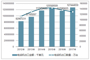 2012-2017年中國(guó)電話機(jī)出口數(shù)量及出口金額走勢(shì)