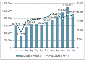 2017年1-12月中國揚聲器出口量及出口金額走勢