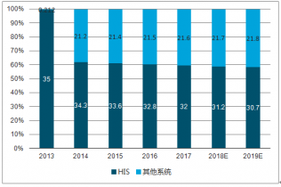 至2018年,CIS系統(tǒng)在醫(yī)療信息化解決方案中占比44.4%,HIS系統(tǒng)占比34.3%。預(yù)計(jì)2018年至2019年,CIS系統(tǒng)的年復(fù)合增長率為23.24%,高于HIS系統(tǒng)的18.80%。