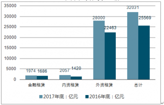 2016-2017年中國融資租賃金額增加及同比增長情況