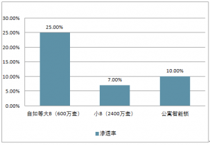 鎖的范圍內(nèi), 不在公寓鎖部分討論; 3000萬套是B2C, 即商家對租客出租, 在這3000萬套里, 有600萬套是自如、魔方、 泊寓等品牌公寓(稱之為大B) 。 品牌公寓里面,整個公寓鎖存量在300萬把左右, 以1套公寓平均2把鎖(有的合租房有內(nèi)門鎖) 測算, 有150萬套公寓安裝了智能鎖,滲透率25%左右;運營剩余2400萬套公寓的小商家(稱為小B) 的智能門鎖滲透率無從測算, 但一定遠低于大B的滲透率, 這些小B可能是個人二房東、 可能是幾個人組成的小創(chuàng)業(yè)公司、 可能是只有一個店面的小中介, 小B的滲透率會略高于家庭門鎖, 在5%-10%之間,取7%, 以此計算, 整個公寓智能鎖市場滲透率在10%左右。(后文市場規(guī)模預(yù)測時,取小B端2017滲透率5%基于此處數(shù)據(jù)分析)