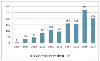 2008-2017年海上風(fēng)電相關(guān)專利申請(qǐng)數(shù)量(單位:項(xiàng))
