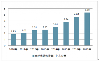 截止到2016年,全球光纖供貨量4.68億芯公里,同比增長22%,增長主要來源于中國在內(nèi)的新興市場;根據(jù)統(tǒng)計,2017年上半年,全球光纖光纜市場火爆,大單采購頻出,出貨量已達2.7億芯公里,預(yù)計全年在5.3-5.6億芯公里之間。