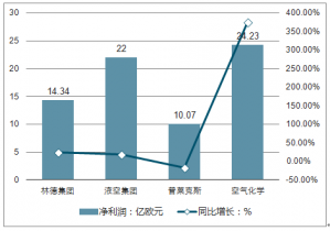 美國(guó)空氣化學(xué)產(chǎn)品增長(zhǎng)迅猛,2017年凈利潤(rùn)達(dá)到24.23億歐元(30億美元),同比增長(zhǎng)375.42%。無(wú)論是凈利潤(rùn)規(guī)模,還是凈利潤(rùn)增速,空氣化學(xué)均位列四大氣體巨頭之首。