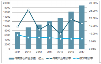 2011~2017年中國傳媒產(chǎn)業(yè)總值與年增長率