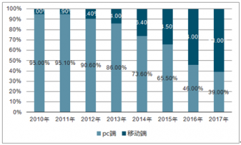 2010-2017年中國(guó)廣告主互聯(lián)網(wǎng)PC端與移動(dòng)端媒體投放費(fèi)用預(yù)算分配比例