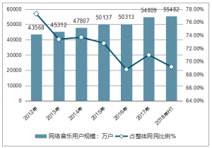 2012-2018年上半年中國(guó)網(wǎng)絡(luò)音樂用戶規(guī)模及占比走勢(shì)
