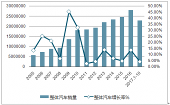 2005-2017年整體汽車銷量及增長率走勢