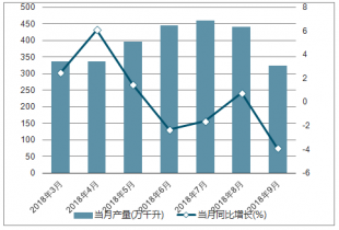 2018年2-9月中國啤酒各月當(dāng)月產(chǎn)量及同比增長走勢(shì)