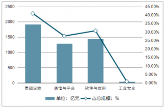 2017年中國(guó)工業(yè)互聯(lián)網(wǎng)細(xì)分領(lǐng)域結(jié)構(gòu)情況中,基礎(chǔ)設(shè)施規(guī)模達(dá)到1912.89億元,占總規(guī)模的40.9%;軟件與應(yīng)用規(guī)模達(dá)到1435.84億元,占比為30.7%;通信與平臺(tái)的規(guī)模為1290.85億元,占比為27.6%;工業(yè)安全為37.42億元,占總規(guī)模的0.8%。