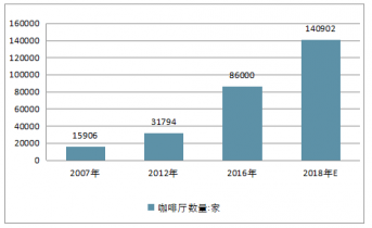 中國咖啡行業(yè)的高速發(fā)展帶動了咖啡連鎖行業(yè),例如咖啡店。據(jù)近年來,我國咖啡廳數(shù)量增長增長十分速。2007年全國約有15906家咖啡廳,到2012年,快速增長到31794家,預(yù)計2018年中國咖啡廳數(shù)量突破14萬家。