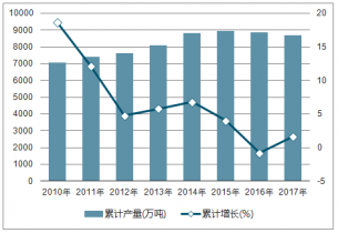2010-2018年中國硫酸(折100%)產量及同比比增長走勢