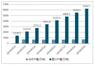 2018年2-9月中國硫酸(折100%)各月當月產量及累計產量走勢