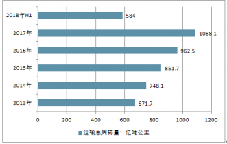 2013-2018年上半年中國(guó)民航運(yùn)輸總周轉(zhuǎn)量及增速走勢(shì)