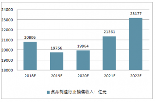 預計,2018年我國食品制造行業(yè)銷售收入將達到20,806億元,未來五年(2018-2022)年均復合增長率約為2.73%,2022年將達到23,177億元。