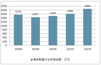 預計2018年我國食品制造行業(yè)利潤總額將達到1,570億元,未來五年(2018-2022)年均復合增長率約為4.33%,2022年將達到1,860億元。