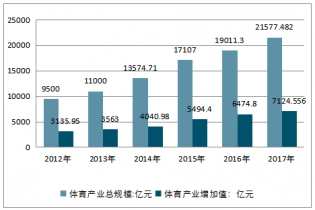 2012-2017年體育產(chǎn)業(yè)總規(guī)模及增加值統(tǒng)計(jì)情況