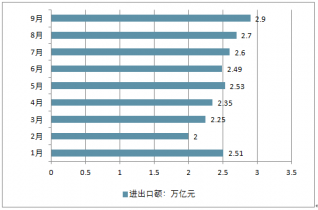 2018年前三季度,我國貨物貿(mào)易進出口總值22.28萬億元人民幣,比去年同期增長9.9%。其中,出口11.86萬億元,增長6.5%,進口10.42萬億元,增長14.1%;貿(mào)易順差1.44萬億元,收窄28.3%。僅9月我國貿(mào)易進出口總額達2.9萬億元,同比增長17.2%。