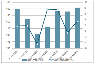 2018年2-9月中國(guó)乙烯各月當(dāng)月產(chǎn)量及同比增長(zhǎng)走勢(shì)