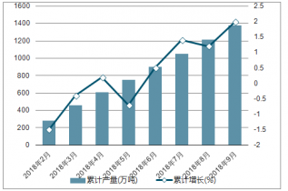 2018年2-9月中國(guó)乙烯各月累計(jì)產(chǎn)量及同比增長(zhǎng)走勢(shì)