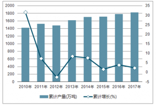 2010-2018年中國(guó)乙烯產(chǎn)量及同比比增長(zhǎng)走勢(shì)