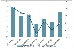 2018年2-9月中合成橡膠各月當月產量及同比增長走勢