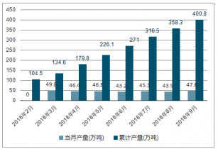 2018年2-9月中合成橡膠各月當月產量及累計產量走勢