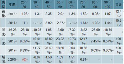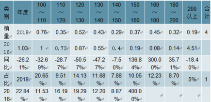 2018年上半年大拖(100馬力以上)各馬力段銷售一覽表 單位:萬(wàn)臺(tái)