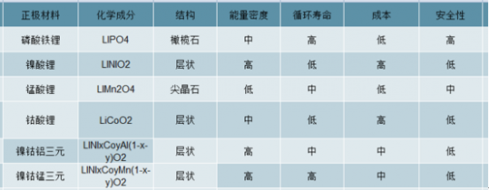 經過工程研究和市場化檢驗,目前市場常見的正極材料如下表所示: